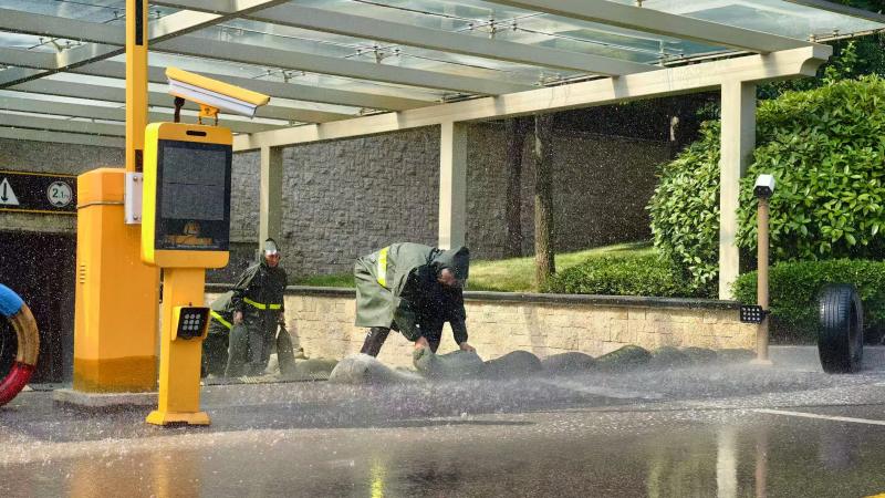 02 防汛及臺風應對演練 針對夏季汛期及臺風季特點,模擬暴雨積水、設施加固等場景。演練涵蓋沙袋快速封堵、排水設備啟動、高空墜物隱患排查、信息預警發布等關鍵環節,確保極端天氣下應急響應工作有序推進。